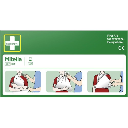 Mitella knyts om halsen för stöd av en skadad arm. Kan också lindas runt huvudet för att hålla en kompress på plats vid huvudskada. Kan också rullas ihop för att användas som tryckförband.